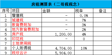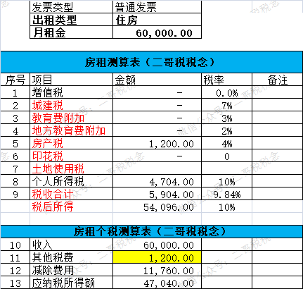 假如出租个人住房取得年租金60000,开具普通发票的话,那么实际应该缴纳的税分别是: