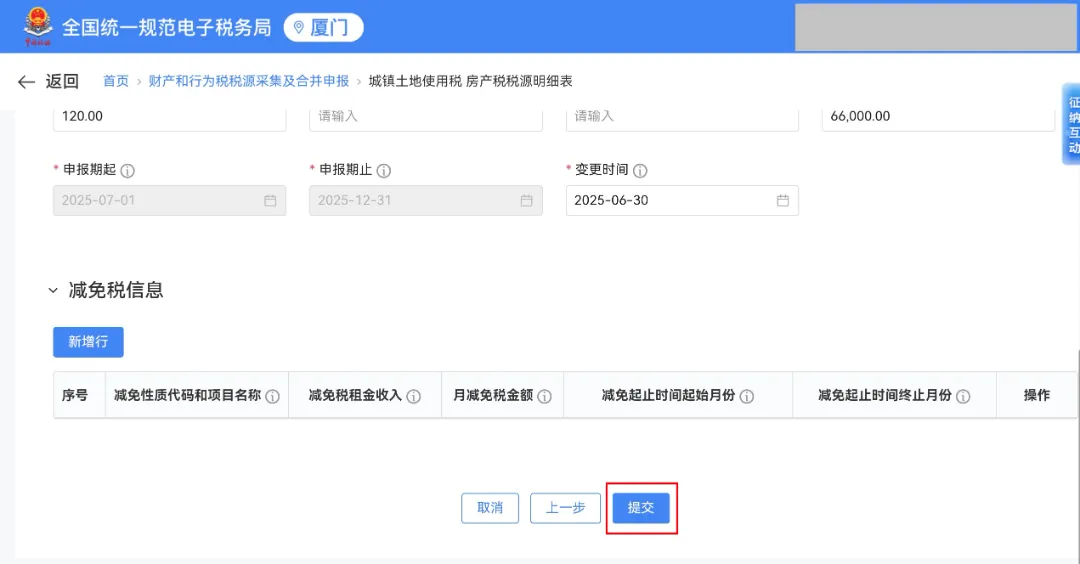 08“申报租金收入”应填写下半年租金总额66000元,变更时间填写2025年6月30日,点击【提交】。