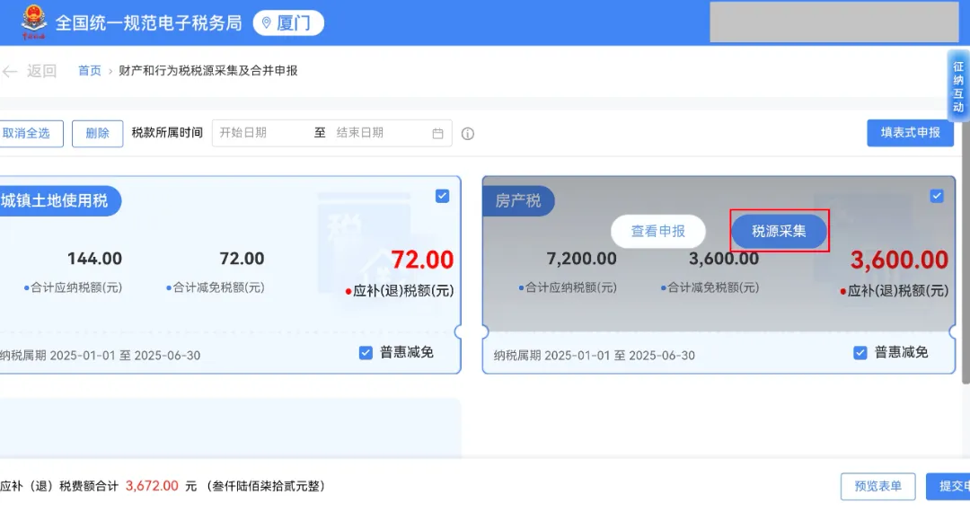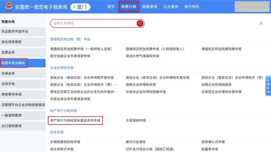 02点击首页的【我要办税】-【税费申报及缴纳】-【财产和行为税税源采集及合并申报】。