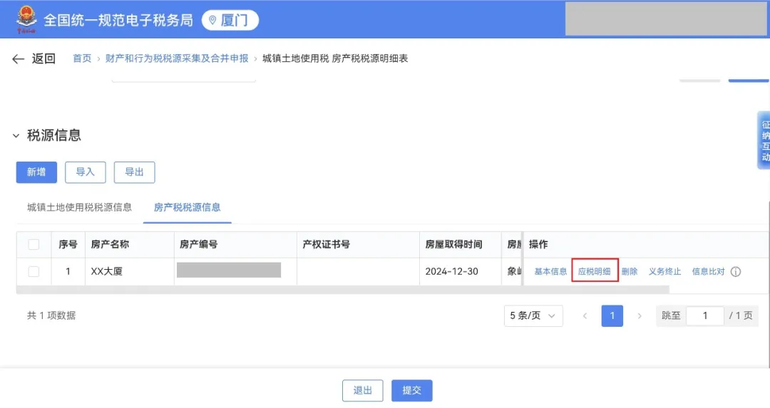 04在房产税税源信息界面找到该房产税源信息,点击【应税明细】。