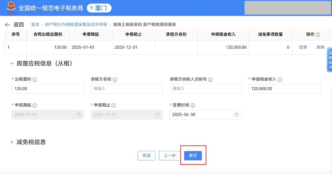 06因7月1日起租金发生变化,因此“变更时间”应选择2025年6月30日,点击【提交】。