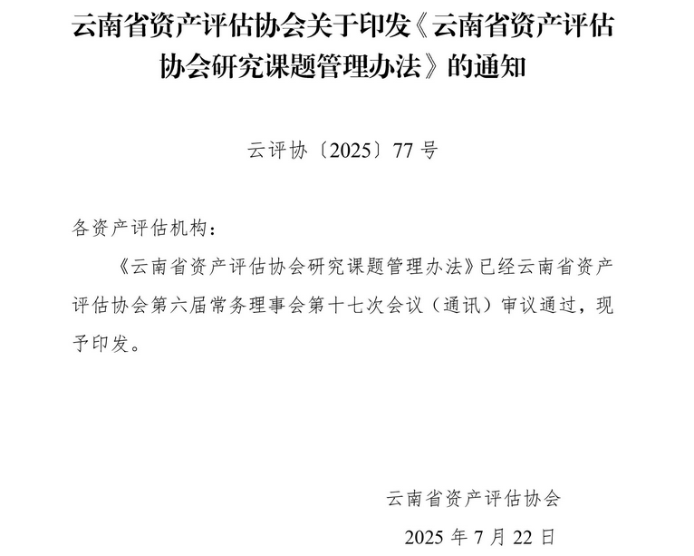 云南省资产评估协会关于印发《云南省资产评估协会研究课题管理办法》的通知