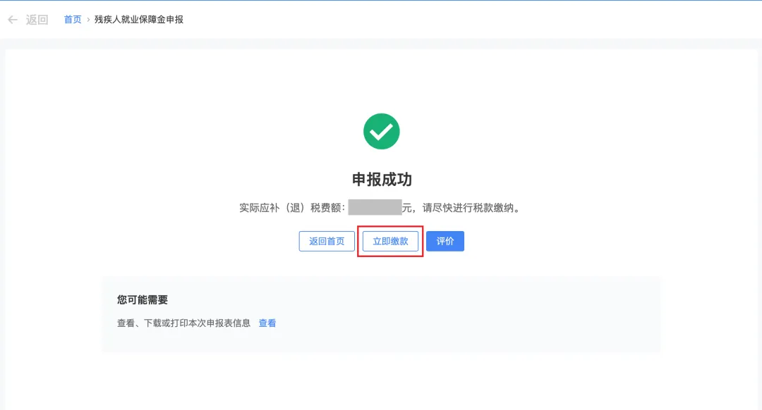 在申报成功界面点击【立即缴款】可自动跳转至缴款环节。