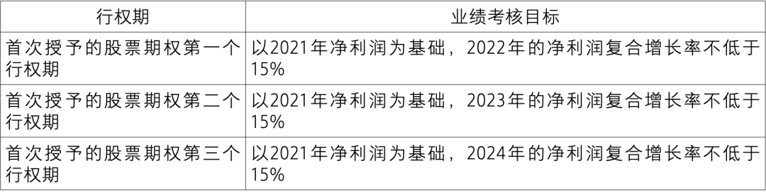 公司层面业绩考核要求:本激励计划授予的股票期权,在行权期的3个会计年度中,分年度进行绩效考核并行权,以达到绩效考核目标作为激励对象的行权条件。首次授予业绩考核目标如下表所示: