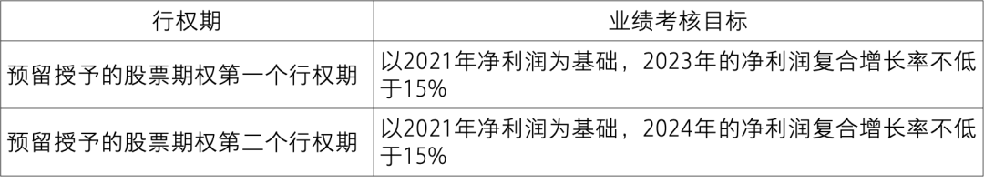 公司层面业绩考核要求:本计划预留授予的股票期权,在行权期的两个会计年度中,分年度进行绩效考核并行权,以达到绩效考核目标作为激励对象的行权条件。预留授予业绩考核目标如下表所示: