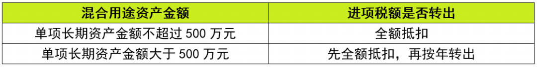 “意见稿”第二十六条规定,长期资产(固定资产、无形资产、不动产)既用于一般计税方法计税项目,又用于五类不允许抵扣项目的(简称混合用途),原值不超过 500万元的单项长期资产,对应的进项税额可以全额从销项税额中抵扣;原值超过500万元的单项长期资产,购进时先全额抵扣进项税额,同时在混合用途期间,应当根据折旧或者摊销年限,再计算五类不允许抵扣项目对应的不得从销项税额中抵扣的进项税额,逐年调整。此举改变了“36号文”规定的固定资产、无形资产、不动产用于混合用途的,其进项税额可以全额抵扣的情况。