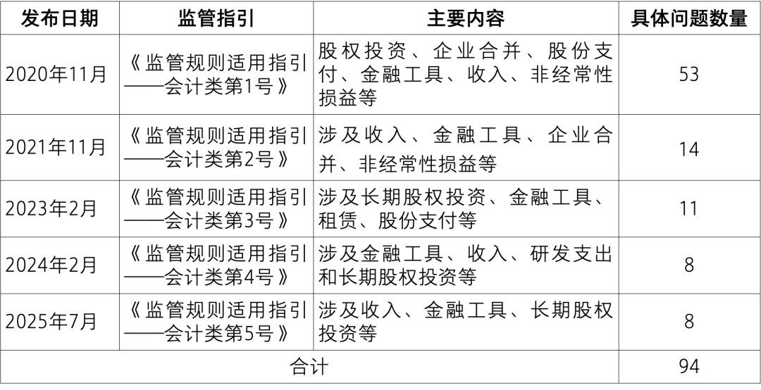 自2020年11月以来,证监会已发布监管规则适用指引会计类1号至5号,累计涉及具体问题94个,具体如下表所示: