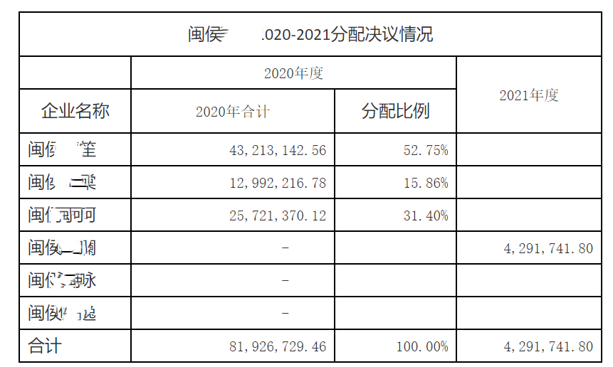 因合伙协议对利润分配规定不明确,根据闽侯*咨询管理合伙企业(有限合伙)提供的合伙人会议决议,2020年和2021年分配情况如下表。