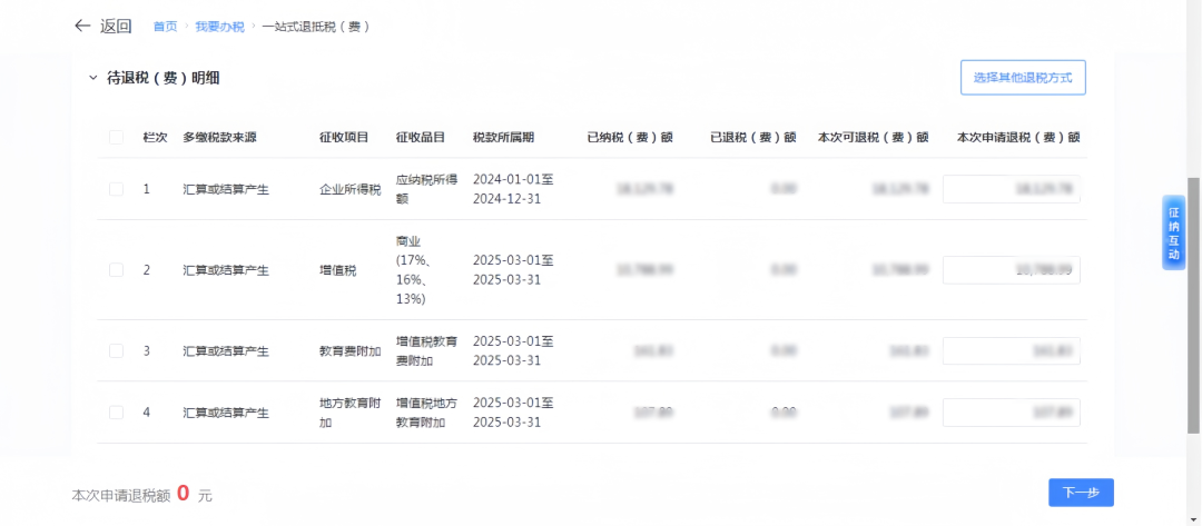 登录电子税务局—我要办税—一般退税管理—一站式退抵税(费)