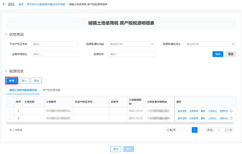 若要录入城镇土地使用税税源信息,点击【新增】,在“城镇土地使用税税源信息”页面录入税源信息。