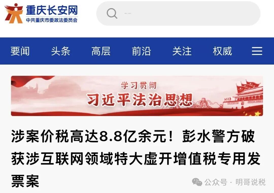 近日,重庆市彭水县公安局历时百余日侦办的涉互联网领域特大虚开增值税专用发票案全面告破,以张某某、程某等人为首的14名犯罪嫌疑人悉数落网,该虚开增值税专用发票案涉及全国26个省市,420余家企业,虚开增值税专用发票共计1.8万余份,价税合计8.8亿余元。