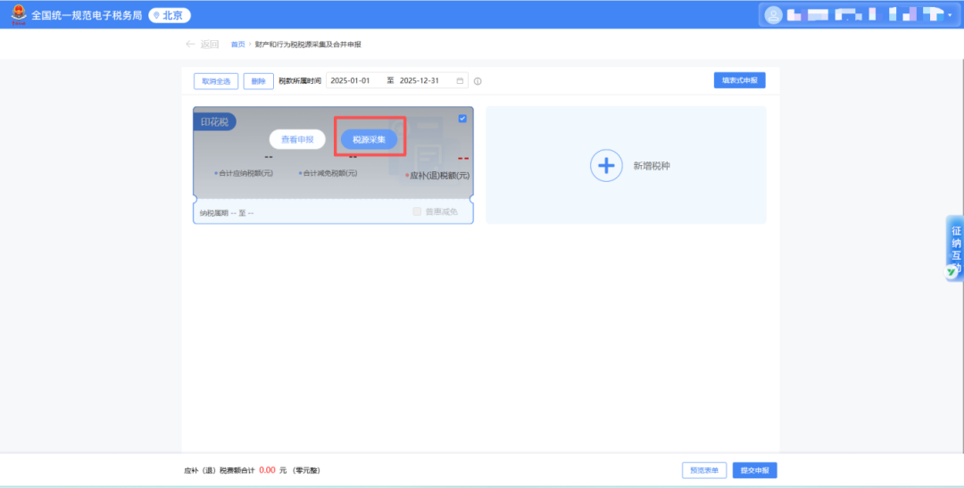 选择【新增税种】-【印花税】-【税源采集】。