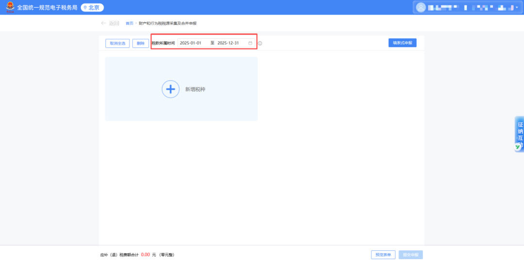 登录新电子税局,点击【我要办税】-【税费申报及缴纳】-【财产和行为税税源采集及合并申报】。