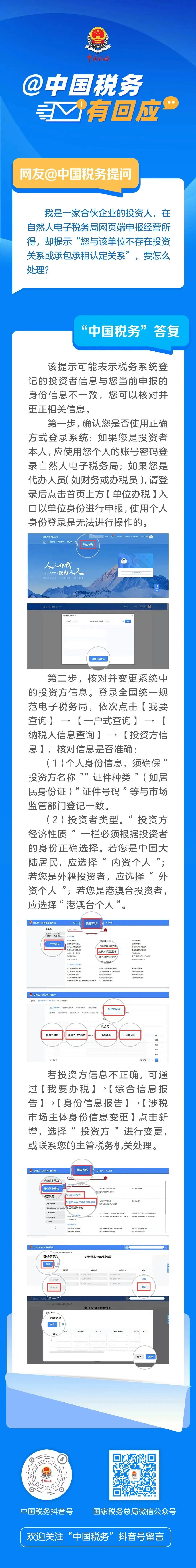 有网友问:“我是一家合伙企业的投资人,在自然人电子税务局网页端申报经营所得,却提示‘您与该单位不存在投资关系或承包承租认定关系’,要怎么处理?”一起来看看回复吧↓