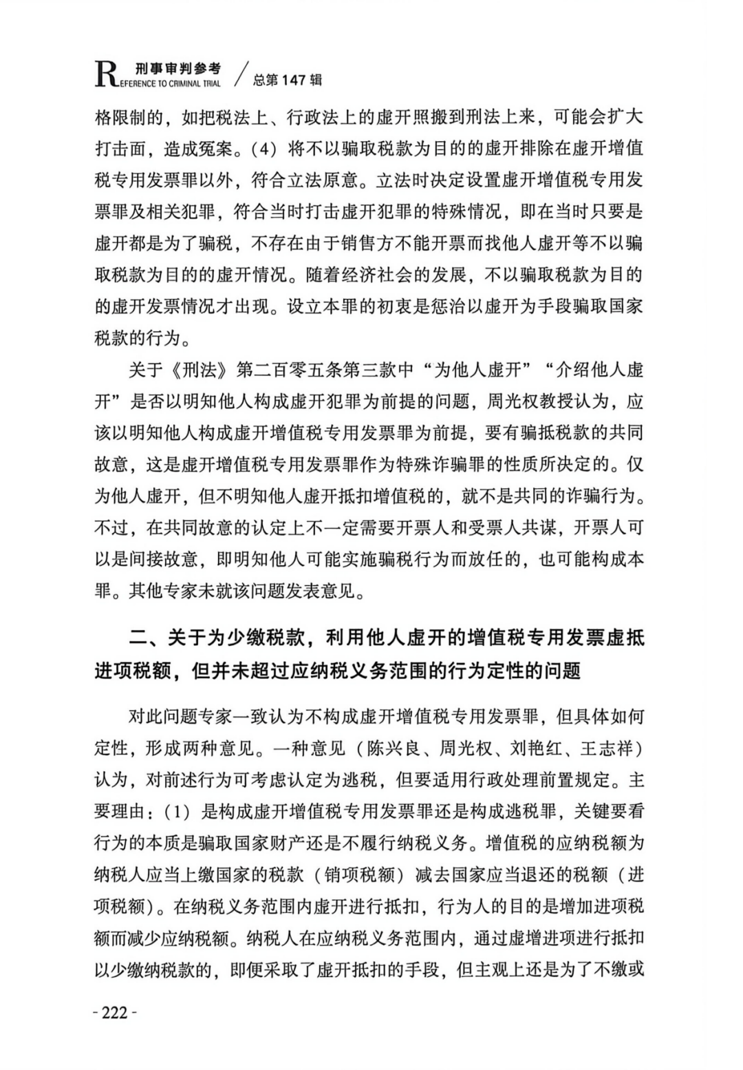 编者按:近日,由最高人民法院刑事审判第四庭编写的《刑事审判参考(惩处危害税收征管犯罪专辑)》已在人民法院出版社出版发行。本书收录了最高人民法院于2025年3月14日组织召开的关于虚开增值税专用发票罪法律适用问题专家论证会的会议纪要,对于从学理上正确理解两高涉税司法解释条款具有重要参考价值和指导意义。现将该部分内容选摘如下: