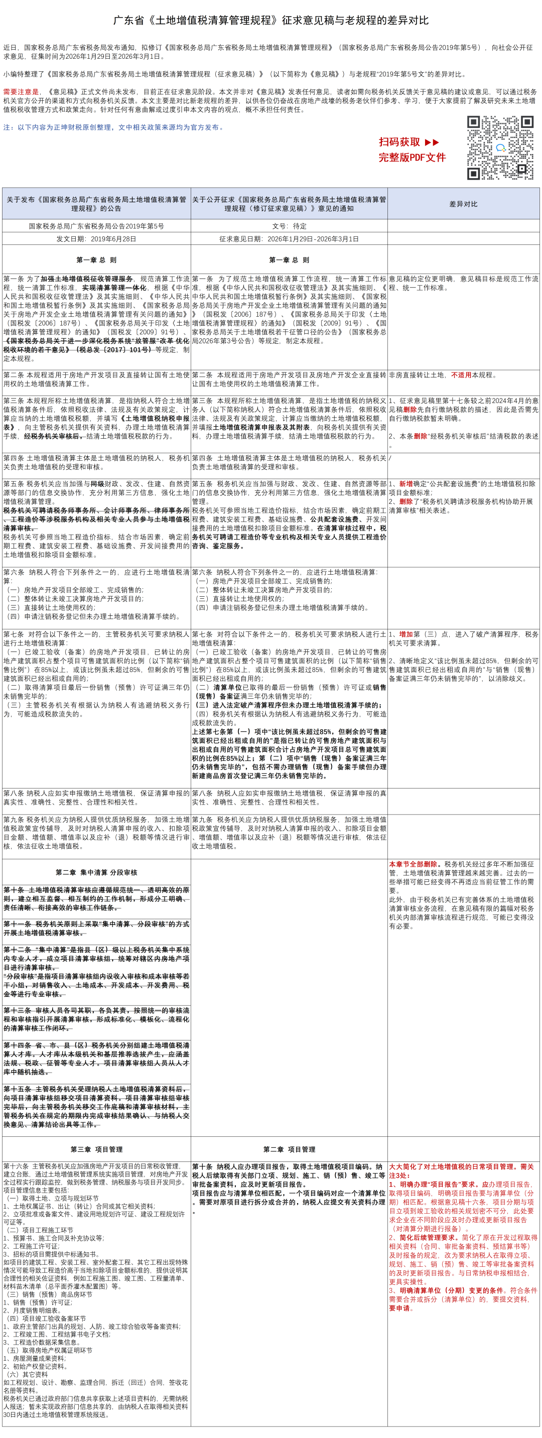 近日,国家税务总局广东省税务局发布通知,拟修订《国家税务总局广东省税务局土地增值税清算管理规程》(国家税务总局广东省税务局公告2019年第5号),向社会公开征求意见,征集时间为2026年1月29日至2026年3月1日。
