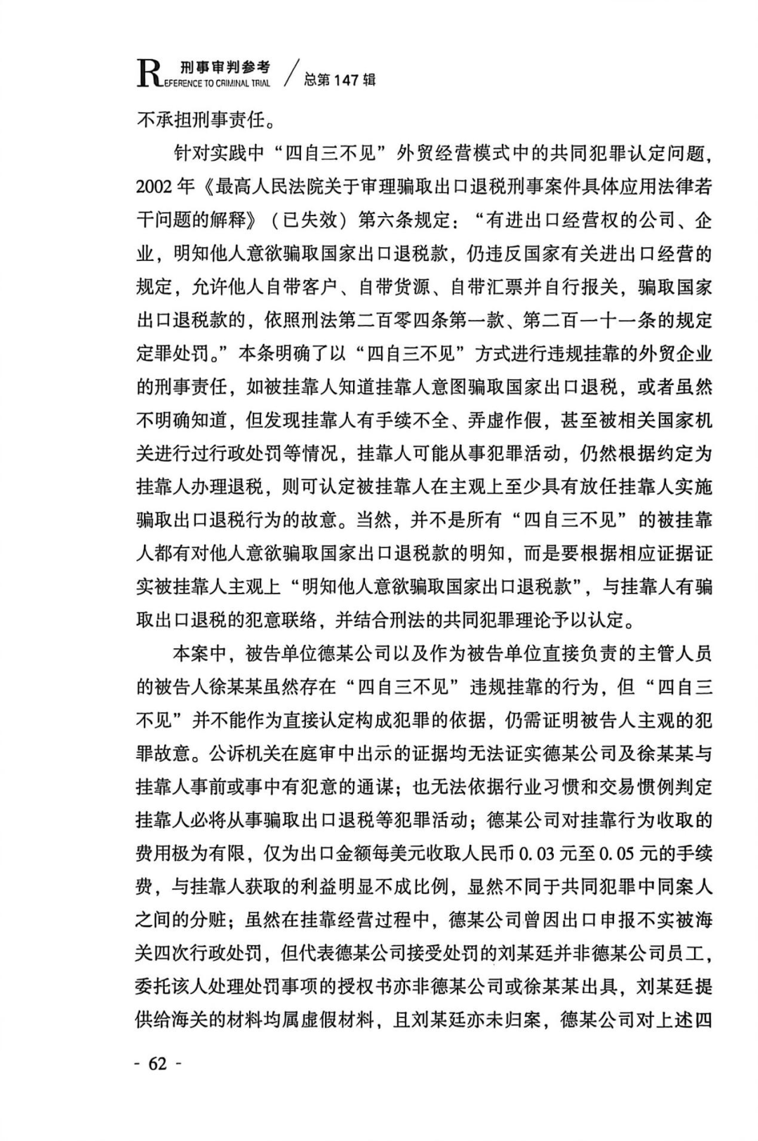 “四自三不见”,本质上属于真实出口方挂靠外贸企业经营,外贸企业以自营名义出口并申请退税,退税后分享退税款的违规经营模式。采用“四自三不见”违规经营模式,真实出口方构成骗取出口退税罪的,外贸企业是否必然构成骗取出口退税罪的共犯?最高法出版的《刑事审判参考》(总第147辑,第1674号)对此作出回应。