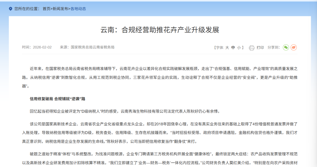 2026年2月,税务总局官方发布了一则名为“云南:合规经营助推花卉产业升级发展”的新闻。新闻中的云南花卉企业因取得虚开发票在2018年度纳税信用被直接降为D级,直到2023年才将纳税信用恢复为B级,2024年度获得A级。可见纳税信用恢复路径之漫长,在纳税信用修复之前,该企业也遭遇了招投标受限、政府项目申请受阻、金融机构信贷难的经营困境。
