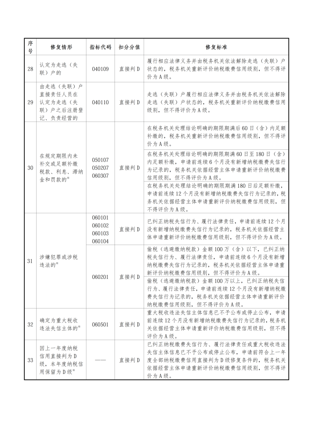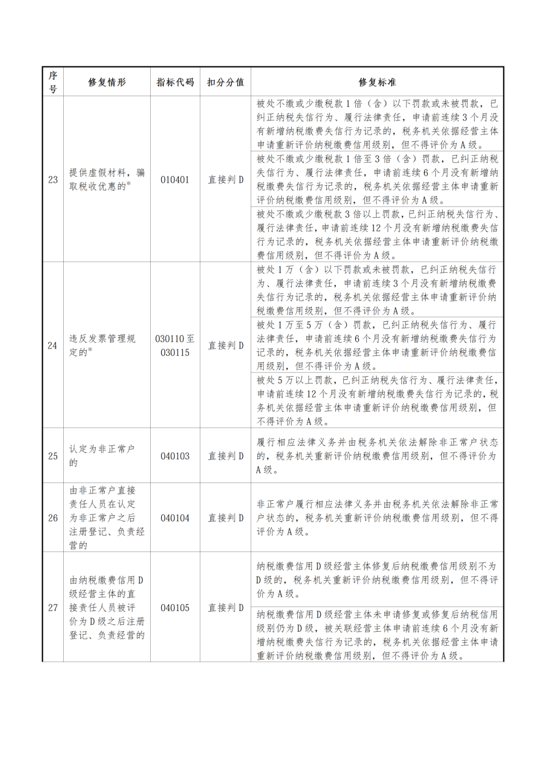 前已述及,对于纳税信用被判定直接降为D级的企业,其修复路径被设置了非常长的时间周期。按照2025年办法,被直接判定为D级的企业,第二年的纳税信用仍然保留为D级,第三年的纳税信用不得评价为A级,企业最早可以在第二年度的纳税信用评级确定之前提出修复申请。2025年办法附件6《纳税缴费信用修复范围及标准》对于直接判定为D级的各种情形均设置了不同的修复标准和条件,具体可参考以下图表: