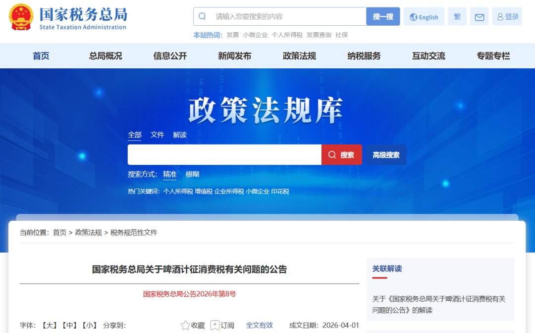 四、本公告自2026年4月1日起施行。《国家税务总局关于啤酒计征消费税有关问题的批复》(国税函〔2002〕166号)同时废止。