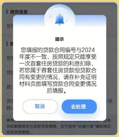 近来,有部分纳税人反映在个人所得税App上填报2026年度的住房贷款利息专项附加扣除时,系统提示“贷款合同编号与以往年度不一致”,这该怎么处理呢?
