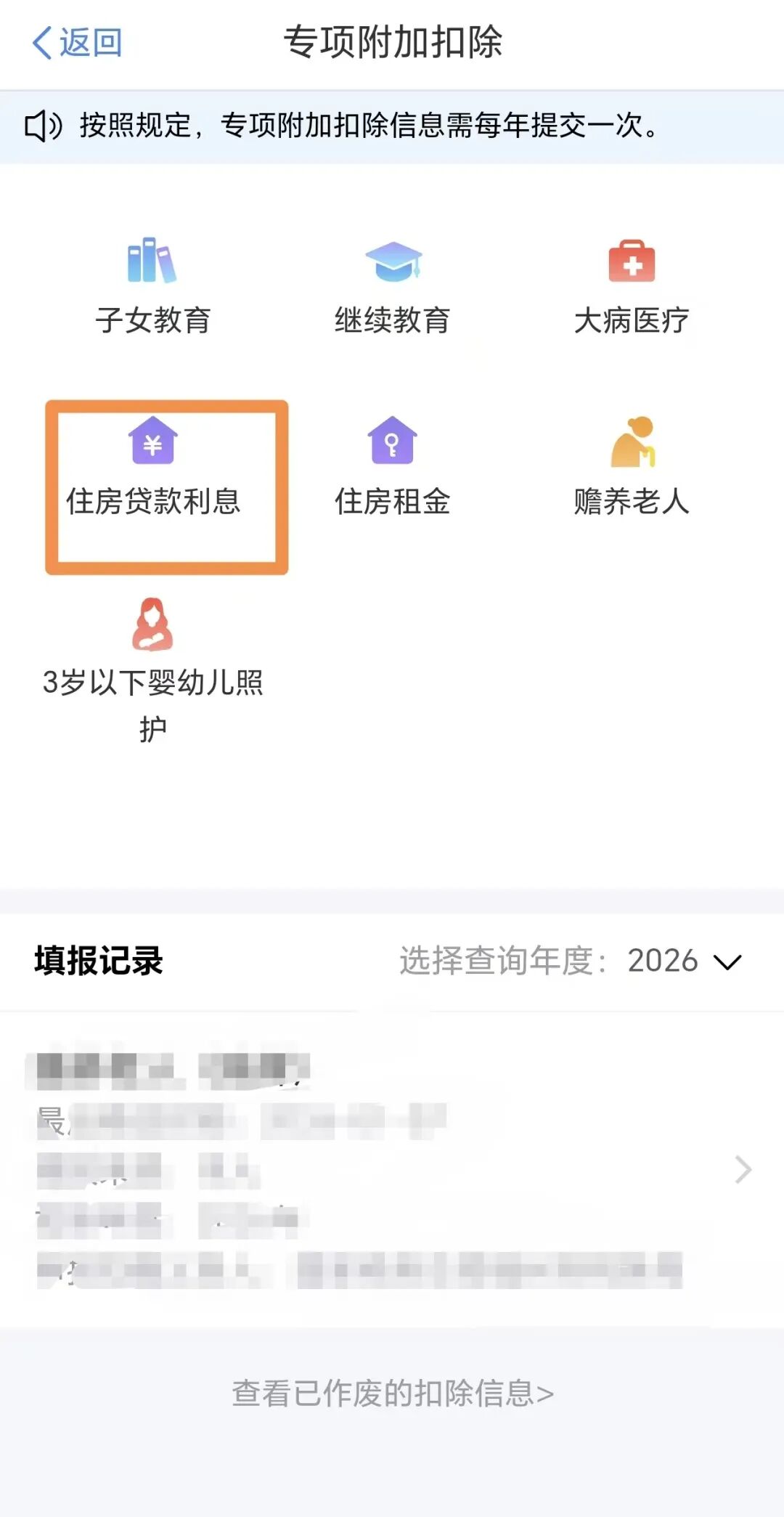 若2026年度的贷款合同编号填写无误,建议依次检查以往年度已采集的住房贷款利息专项附加扣除信息,查询步骤:点击“办&查”→点击“专项附加扣除”→选择查询年度→进入填报详情查看信息。