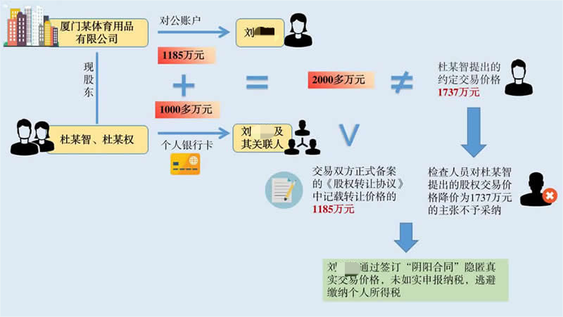 2023年,厦门市税务局第二稽查局收到一封关于举报刘某某在股权转让过程中涉嫌逃避缴纳个人所得税的举报信。举报人反映,2018年10月刘某某将厦门某体育用品有限公司100%股权以实际成交价2987万元转让给杜某智、杜某权,双方纸面签订的工商备案合同标价却仅为1185万,与实际成交价相比价格悬殊。