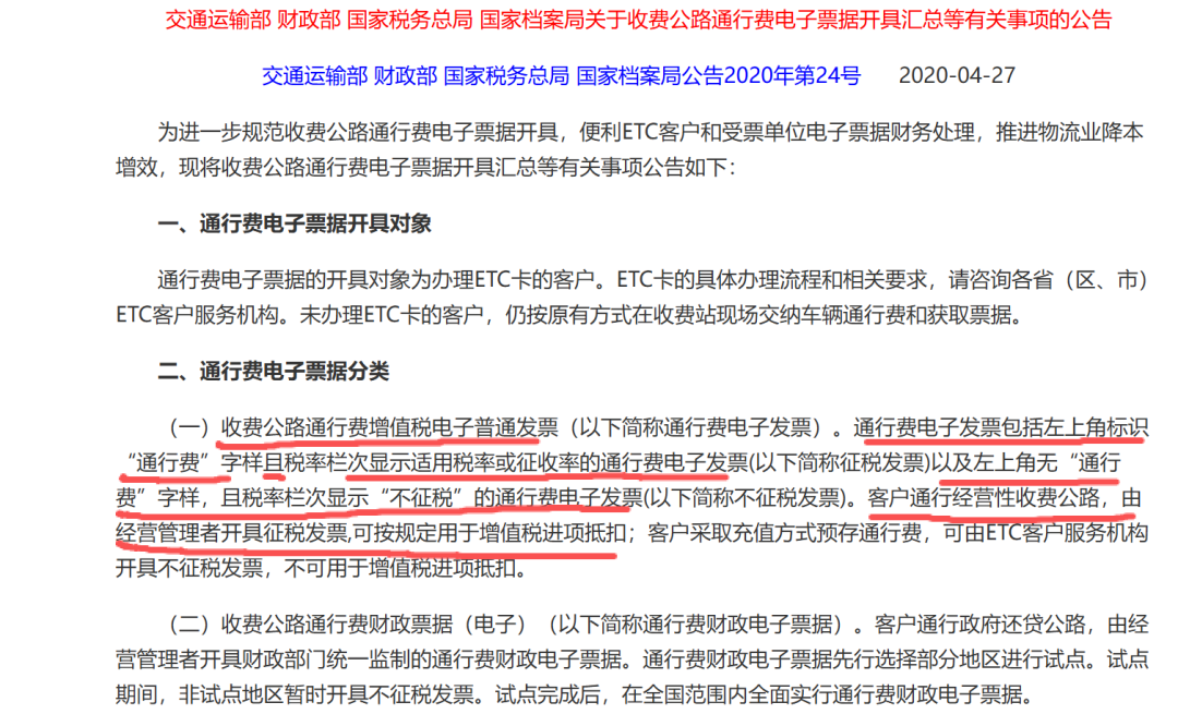 左上角没有通行费三个字的,就不是收费公路通行费电子发票。交通运输部 财政部 国家税务总局 国家档案局公告2020年第24号 关于收费公路通行费电子票据开具汇总等有关事项的公告,(一)收费公路通行费增值税电子普通发票(以下简称通行费电子发票)。通行费电子发票包括左上角标识“通行费”字样且税率栏次显示适用税率或征收率的通行费电子发票(以下简称征税发票)以及左上角无“通行费”字样,且税率栏次显示“不征税”的通行费电子发票(以下简称不征税发票)。客户通行经营性收费公路,由经营管理者开具征税发票,可按规定用于增值税进项抵扣;客户采取充值方式预存通行费,可由ETC客户服务机构开具不征税发票,不可用于增值税进项抵扣。