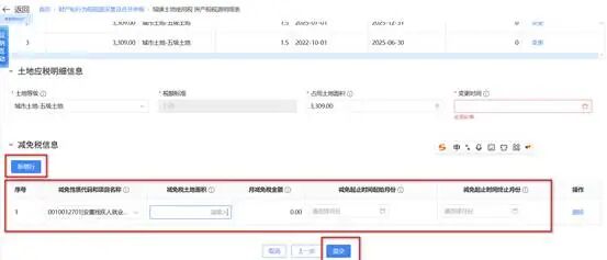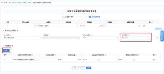3.录入对应的“减免税土地面积”“月减免税金额”“减免起止时间起始月份”“减免起止时间终止月份”后,填写变更日期,变更时间填写“2025-12-31”,点击“提交”即可完成减免税信息维护。
